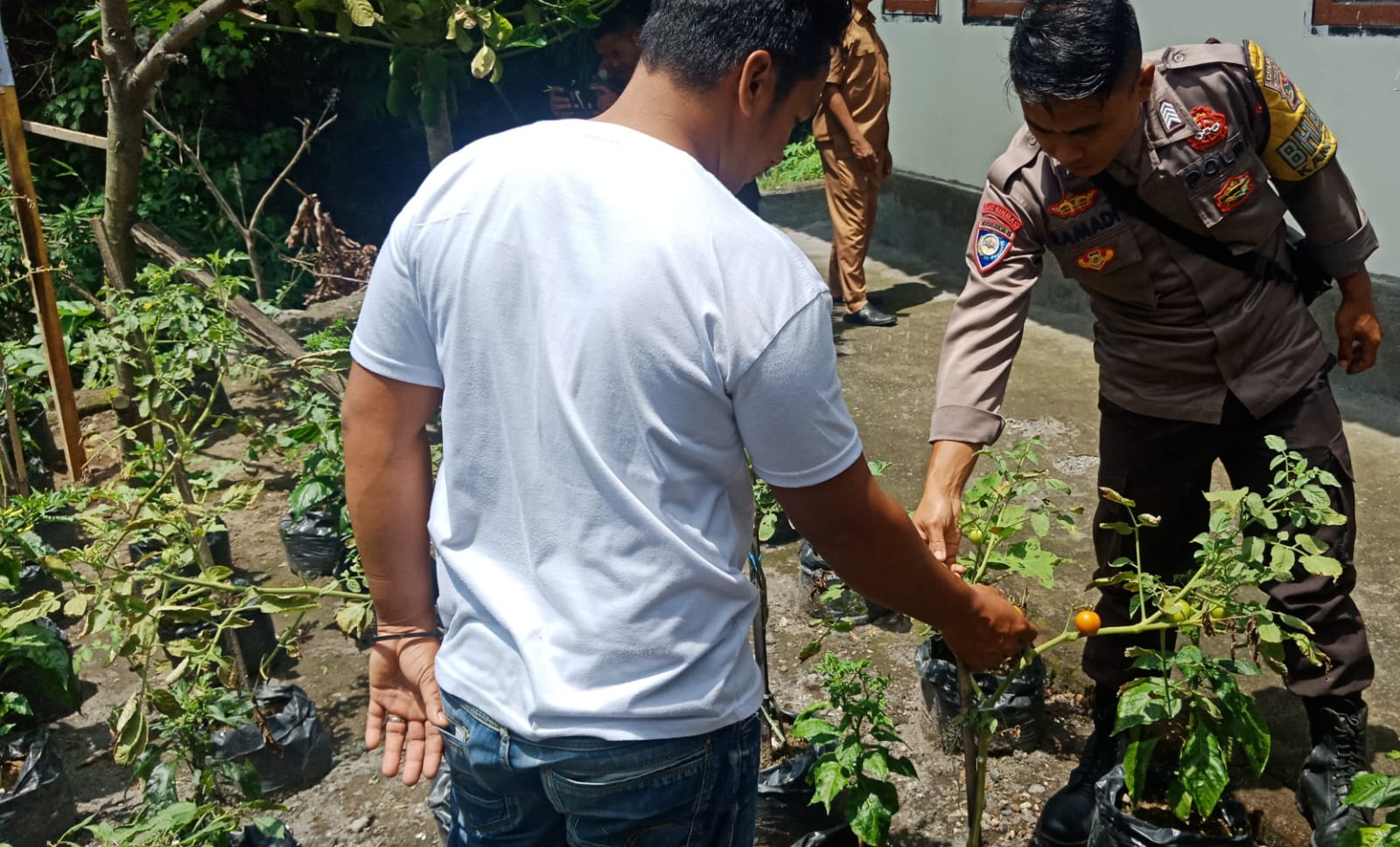 Selanjutnya, rombongan Bhabinkamtibmas bersama kelompok tani melakukan pengecekan langsung terhadap lahan yang telah digunakan untuk budidaya tanaman tomat, cabai, dan terong. Pemeriksaan dilakukan dengan seksama untuk memastikan bahwa tanaman yang ditanam dalam rangka program P2B tersebut tumbuh dengan baik dan mendapatkan perawatan yang optimal. Para petani juga diberi kesempatan untuk menyampaikan kendala yang mereka hadapi, seperti masalah irigasi, serangan hama, dan kekurangan nutrisi pada tanaman. Diskusi tersebut menjadi forum untuk berbagi pengalaman dan mencari solusi bersama guna meningkatkan produktivitas lahan.
