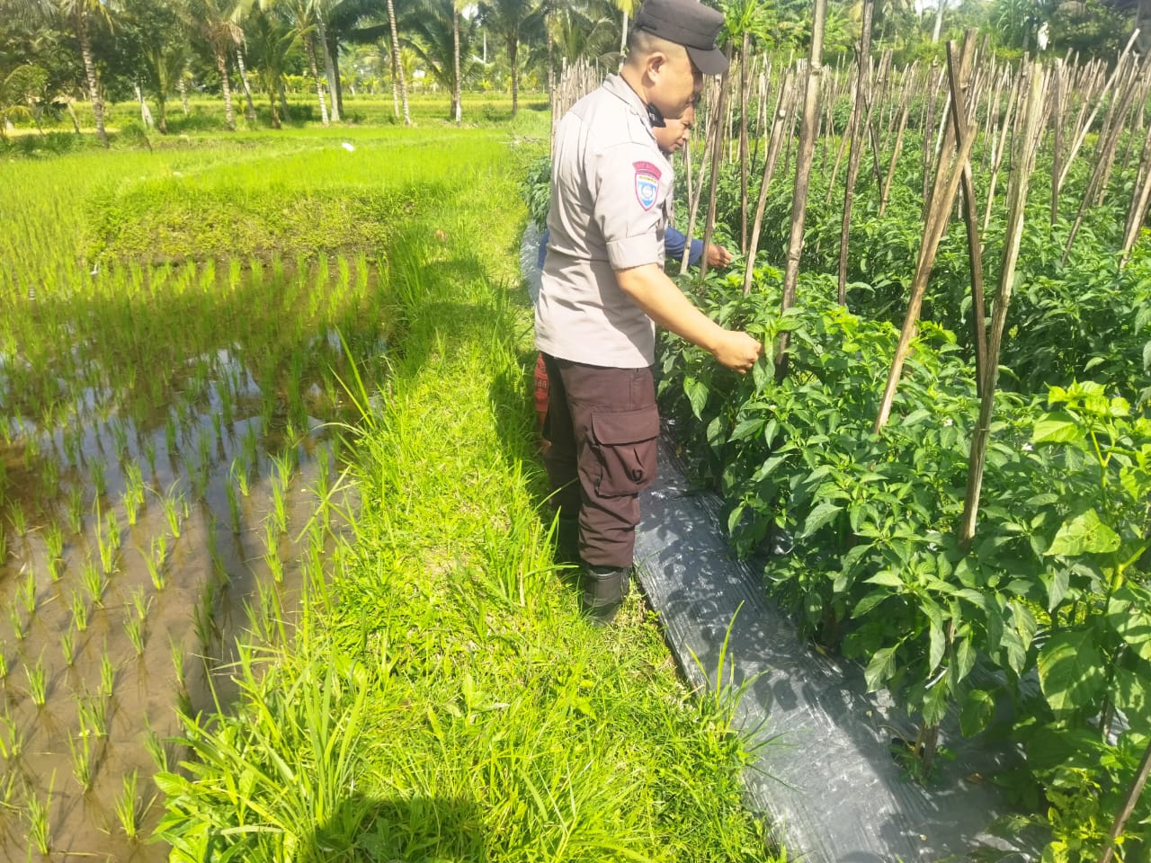 Bripka Slamet tidak hanya melakukan silaturahmi, tetapi juga secara langsung melakukan pengecekan perkembangan tanaman cabai di lahan tersebut. Pemeriksaan ini bertujuan untuk memastikan bahwa tanaman tumbuh dengan baik dan mendukung target dari program P2B dalam meningkatkan kualitas gizi dan kemandirian pangan masyarakat setempat.