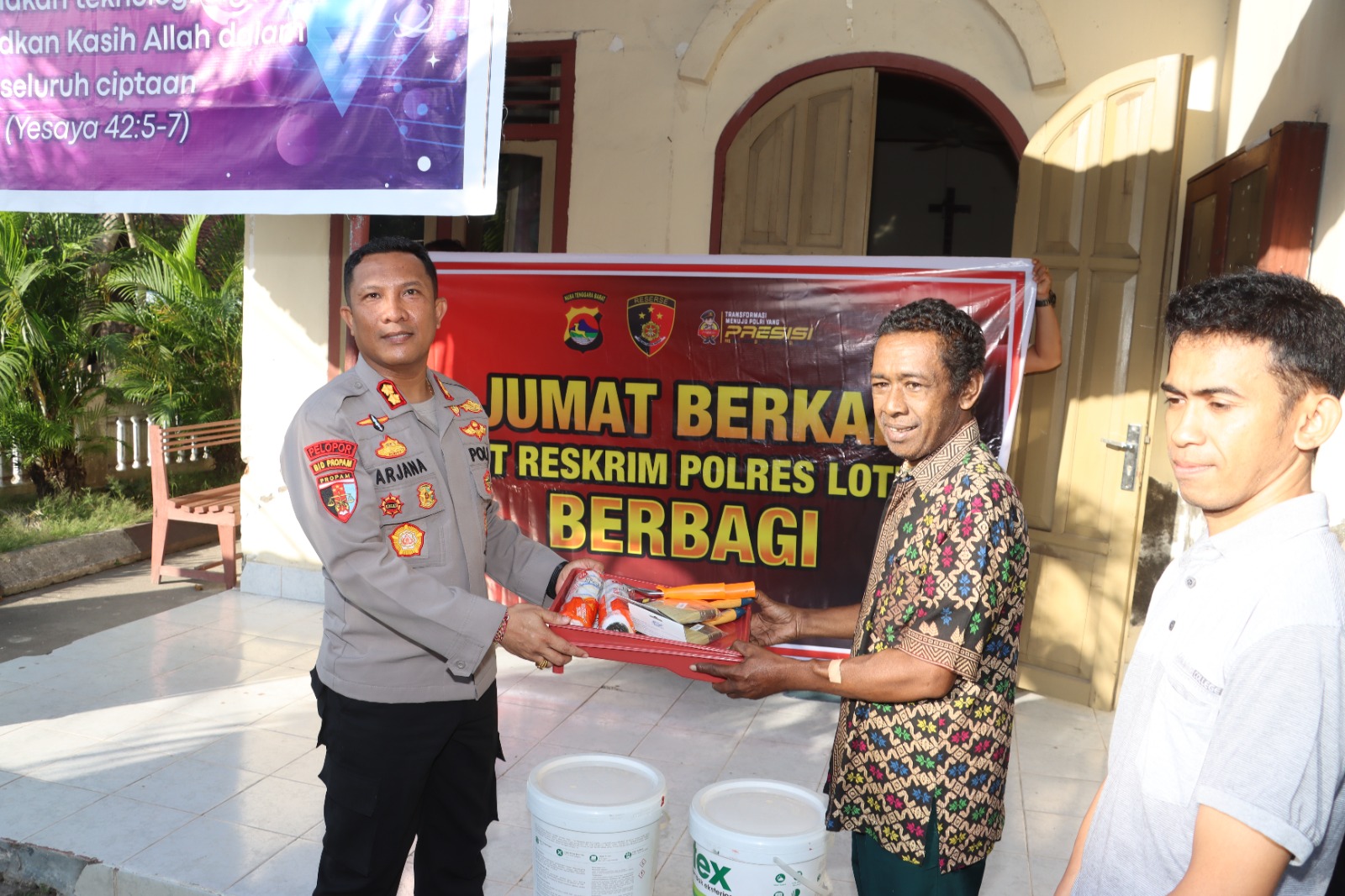Lombok Timur – Dalam rangka menjalankan Program Jum’at Berkah Sat Reskrim Berbagi, Kepolisian Resor Lombok Timur kembali menunjukkan komitmennya terhadap toleransi dan kepedulian sosial lintas umat beragama. Pada Jumat (13/06/2025) pukul 08.22 Wita, Kapolres Lombok Timur AKBP I Komang Sarjana, S.I.K., S.H. menyerahkan bantuan secara simbolis kepada pengurus Gereja Bait Allah.