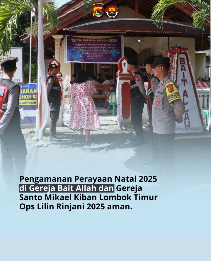Lombok Timur – Pengamanan Perayaan Natal 2025 di Gereja Bait Allah dan Gereja Santo Mikael Kiban, Kabupaten Lombok Timur, berlangsung aman, tertib, dan kondusif. Kamis (25/12/25), pukul 07.30 Wita.
