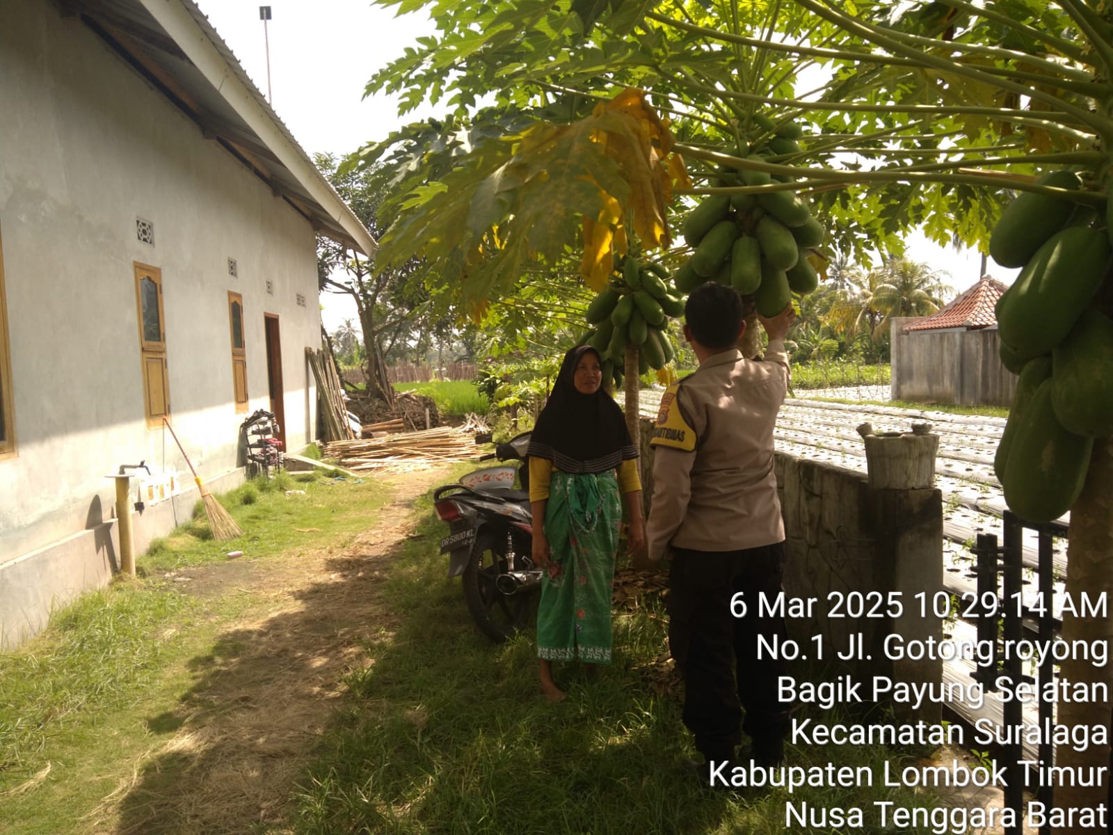 Lombok Timur – Aiptu Hamdan Yuapina, Bhabinkamtibmas Bagik Payung Selatan Polsek Suralaga, melaksanakan pemantauan terhadap lahan Pekarangan Pangan Bergizi (P2B) yang dikelola oleh salah satu warga binaannya di Dusun Gotong Royong, Desa Bagik Payung Selatan. Pemantauan ini dilakukan sebagai bagian dari tugas untuk memastikan keberhasilan program P2B yang bertujuan untuk meningkatkan ketahanan pangan di tingkat rumah tangga.