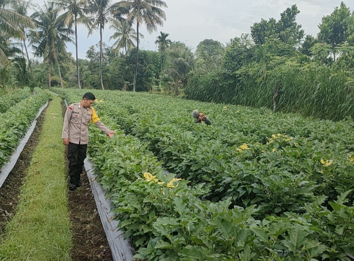 Pada kesempatan ini, Bripka Hamidi melakukan pemantauan langsung terhadap tanaman terong yang ditanam di lahan milik warga setempat.