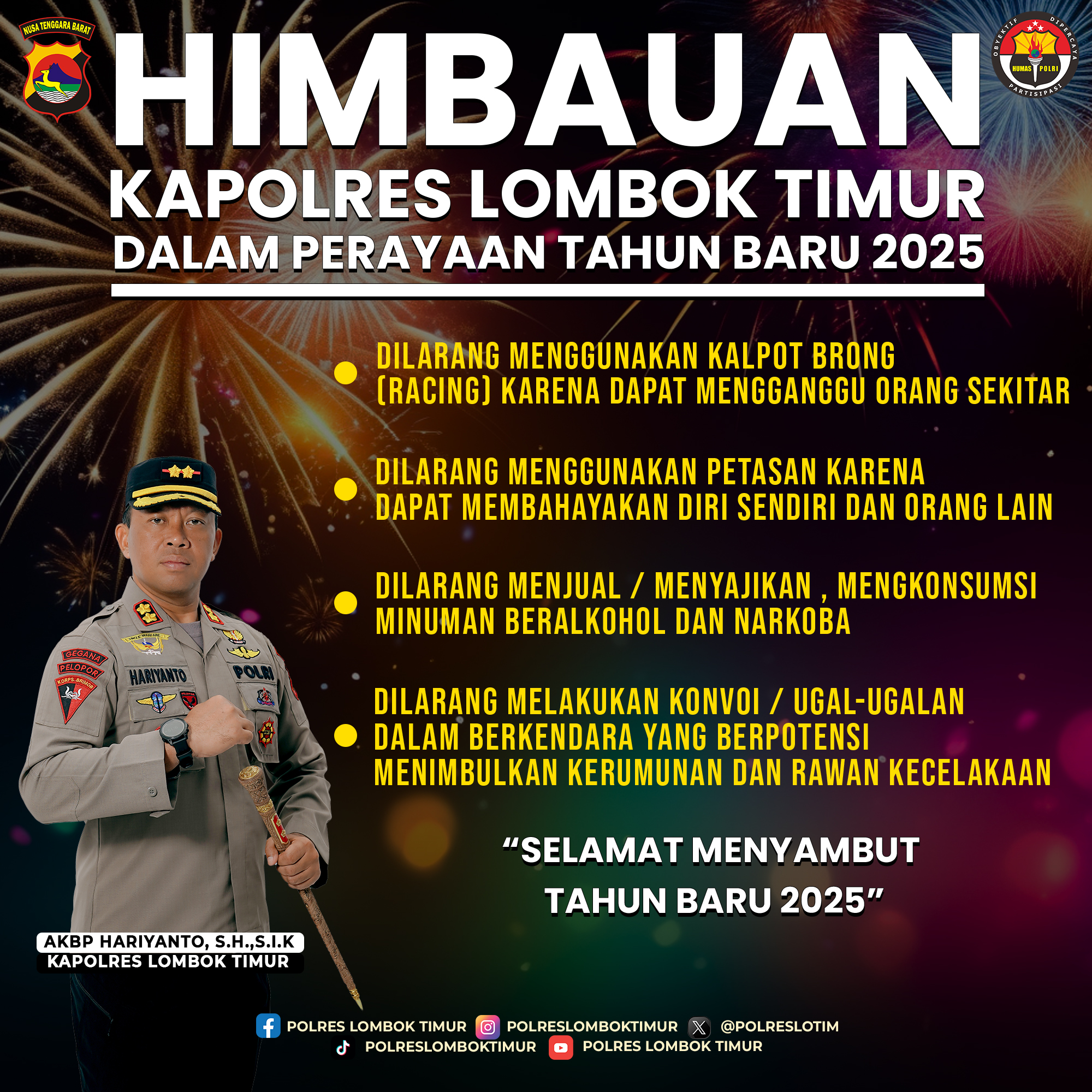 Lombok Timur – Menyambut perayaan Tahun Baru 2025, Kapolres Lombok Timur, AKBP Hariyanto, SH., S.I.K., mengeluarkan imbauan kepada seluruh masyarakat Kabupaten Lombok Timur untuk menjaga keamanan dan ketertiban. Imbauan ini bertujuan untuk memastikan perayaan tahun baru berjalan dengan aman, tertib, dan tidak mengganggu kenyamanan serta keselamatan masyarakat.