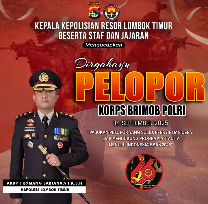 Lombok Timur – Kepolisian Resor (Polres) Lombok Timur menyampaikan ucapan selamat dalam rangka Hari Ulang Tahun ke-66 Pasukan Pelopor Korps Brimob Polri yang jatuh pada tahun 2025. Momentum ini menjadi penghargaan atas dedikasi dan pengabdian panjang pasukan elit Polri tersebut sejak dibentuk pada tahun 1959.