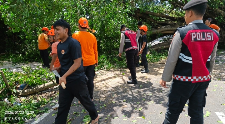 Lombok Timur – Sebuah pohon tumbang terjadi di Jalan Raya Gelang menuju Selong, tepatnya di samping Indomart Gelang, Desa Dasan Lekong, Kecamatan Sukamulia, Kabupaten Lombok Timur, pada Jumat, 23 Januari 2026 sekitar pukul 13.00 WITA. Pohon jenis beringin dengan diameter kurang lebih 50 sentimeter tersebut tumbang dan menghalangi badan jalan, sehingga akses lalu lintas dari Gelang menuju Selong sempat terganggu.