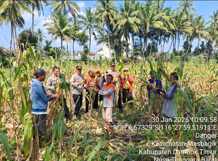 Lombok Timur – Bhabinkamtibmas Desa Danger Polsek Masbagik, Aipda Muhtar, bersama Kapolsek Masbagik AKP I Wayan Sukarsana, S.H., Kanit Binmas IPTU L. Hidayat, S., dan Panit Intelkam IPDA Jasmadi melaksanakan kegiatan panen raya jagung dalam rangka Program Ketahanan Pangan Bergizi (P2B).