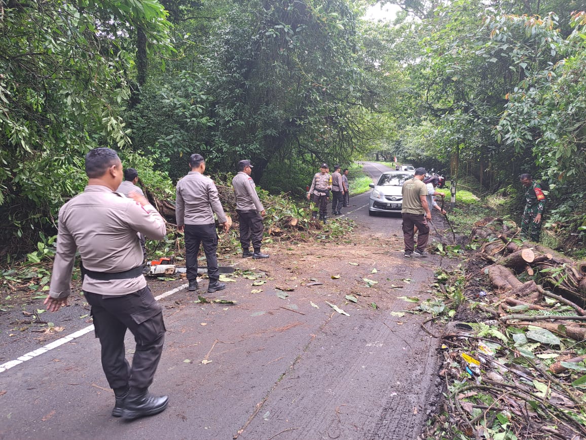 Lombok Timur — Kapolsek Suela bersama anggota Polsek Suela melakukan pembersihan pohon tumbang yang menghalangi jalan raya jurusan Suela menuju Sembalun, tepatnya di kawasan Taman Nasional Gunung Rinjani, Dusun Pesugulan, Desa Sapit, Kecamatan Suela, Kabupaten Lombok Timur, pada Rabu, 31 Desember 2025, sekitar pukul 10.00 Wita.